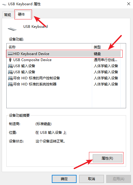 5.進(jìn)入U(xiǎn)SB Keyboard屬性界面,在頂部點(diǎn)擊【硬件】,選擇【鍵盤】,然后點(diǎn)擊【屬性】。