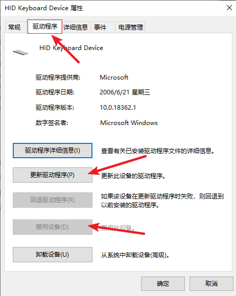 6.在以下界面頂部點(diǎn)擊【驅(qū)動(dòng)程序】,然后點(diǎn)擊“跟新驅(qū)動(dòng)程序”,最后點(diǎn)擊“禁用設(shè)備"即可