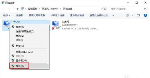 5.進入網(wǎng)絡(luò)連接頁面,右鍵單擊【W(wǎng)LAN】,下拉找到【屬性】按鈕。