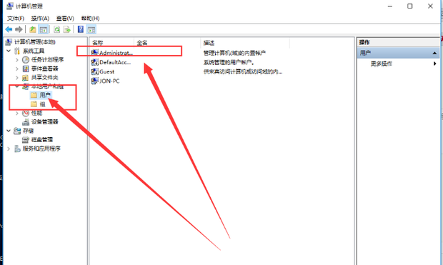 2.進(jìn)入管理界面,在左側(cè)點(diǎn)擊【本地用戶和組】,然后在右側(cè)依次選擇【用戶】-【Administrator】。