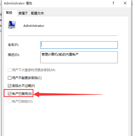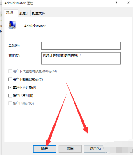 3.把【賬戶已禁用】前的勾取消,然后點(diǎn)擊應(yīng)用和確定就可以獲得管理員權(quán)限了。