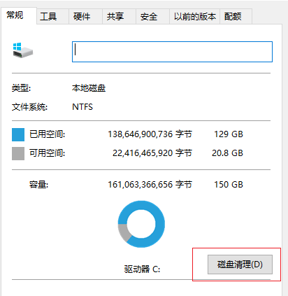 2.進入系統(tǒng)盤屬性界面,點擊【磁盤清理】按鈕。