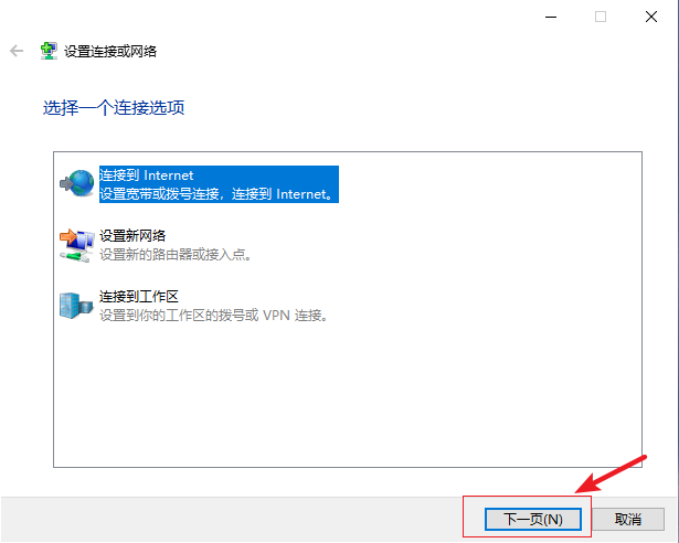 3.在以下頁面選擇【連接到Internet】,然后點(diǎn)擊【下一頁】繼續(xù)操作。
