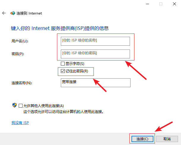 5.在以下頁面中輸入要連接的網(wǎng)絡(luò)的用戶和密碼,然后勾選【記住此密碼】,點(diǎn)擊【連接】。