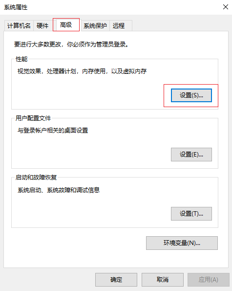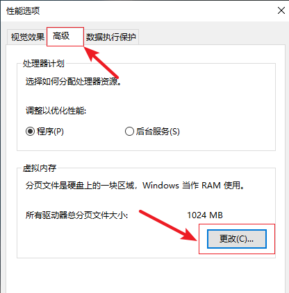 4.在彈出的性能選項中依次點擊【高級】-【更改】。