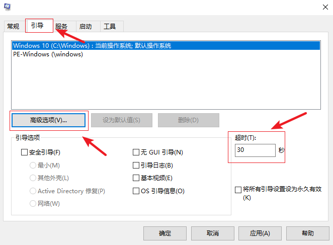 2.進(jìn)入以下界面,上方切換到【引導(dǎo)】選項卡,把【超時】設(shè)置為【30】秒,然后點(diǎn)擊【高級選項】。