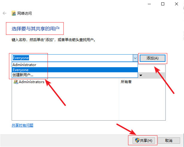 3.在彈出的界面中,在【選擇要與其共享的用戶】下選擇用戶,然后點(diǎn)擊【添加】,最后點(diǎn)擊下方的【共享】按鈕即可。