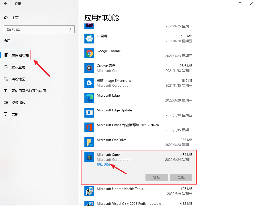 2.進(jìn)入后,在左側(cè)選擇【應(yīng)用和功能】,在右側(cè)下拉找到并點(diǎn)開(kāi)【Microsoft Store】,選擇【高級(jí)選項(xiàng)】。