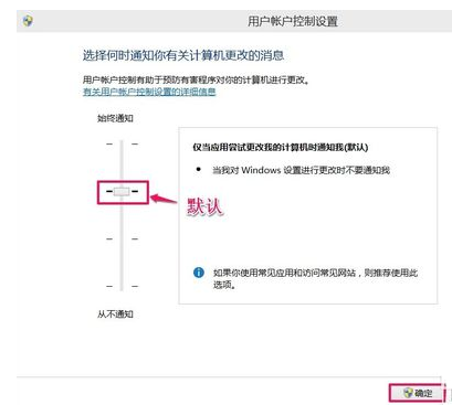 2.進(jìn)入用戶(hù)帳戶(hù)控制設(shè)置窗口,用鼠標(biāo)把左邊的滑塊往上拉至默認(rèn)的位置,然后點(diǎn)擊【確定】。
