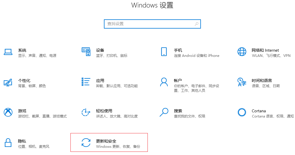 1.在鍵盤上按下【win+i】組合鍵,調(diào)出設(shè)置選項界面,選擇【更新和安全】進(jìn)入。