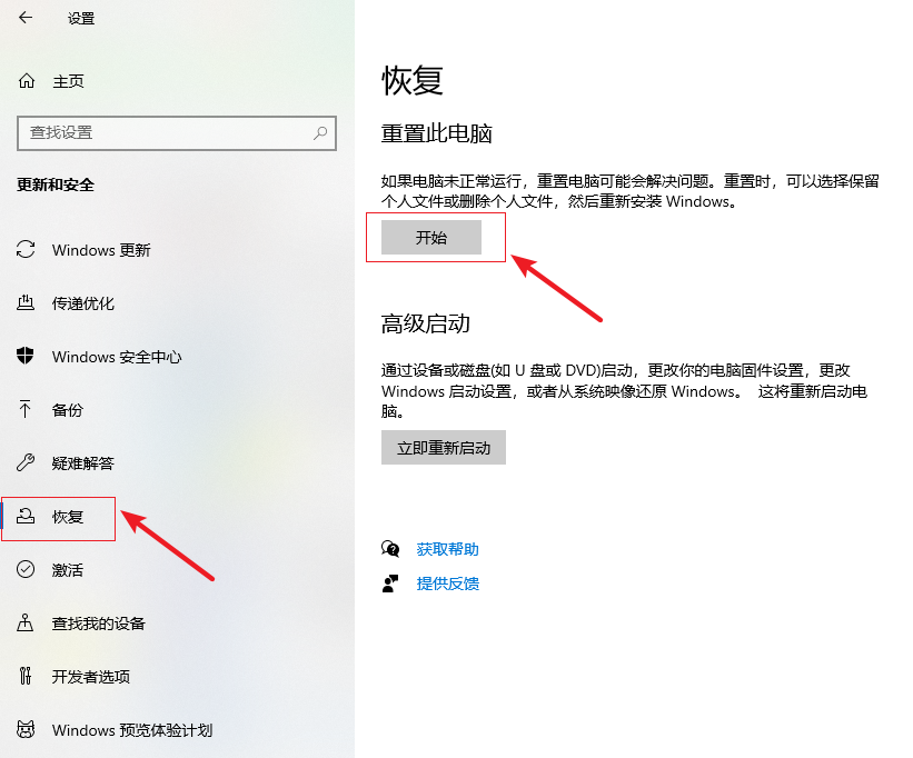 2.進(jìn)入后,在左側(cè)選擇【恢復(fù)】,然后點擊右側(cè)重置電腦下的【開始】。