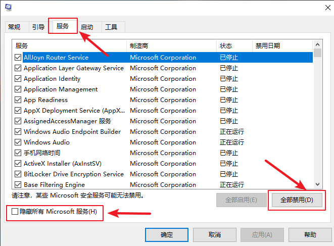 2.進(jìn)入系統(tǒng)配置界面,上方選項(xiàng)卡切換到【服務(wù)】,取消勾選下方的【隱藏所有的Microsoft】,然后點(diǎn)擊【全部禁用】。