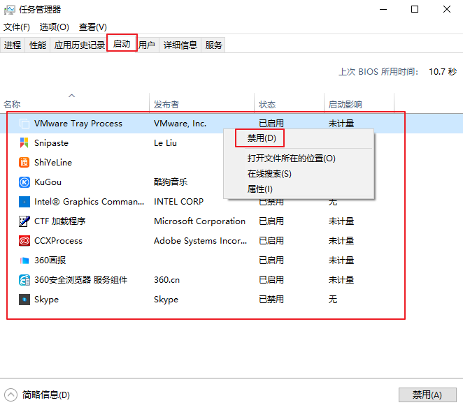 4.進(jìn)入任務(wù)管理器界面,點(diǎn)擊上方【啟動】選項(xiàng)卡,然后對每個啟動項(xiàng)都右擊,選擇【禁用】,所有項(xiàng)都禁用完成后,退出任務(wù)管理器。