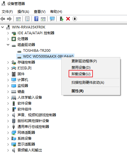 2.進(jìn)入后,在【磁盤驅(qū)動器】里找到你的移動設(shè)備,然后右擊,選擇【卸載設(shè)備】。卸載完成之后重新插入USB設(shè)備,等待自動加載即可。