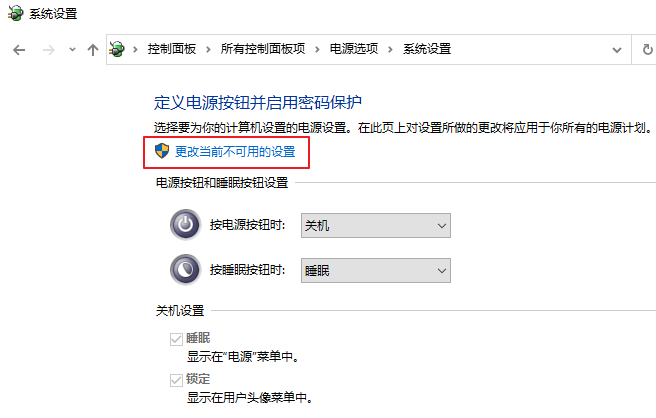 4.點擊【更改當(dāng)前不可用的設(shè)置】,勾選【啟用快速啟動】,點擊保存修改即可。
