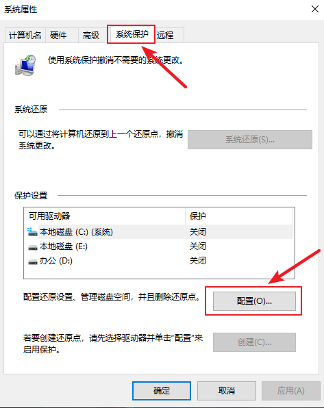 3.進(jìn)入系統(tǒng)屬性界面,上方的選項(xiàng)卡切換到【系統(tǒng)保護(hù)】,然后點(diǎn)擊下方的【配置】。