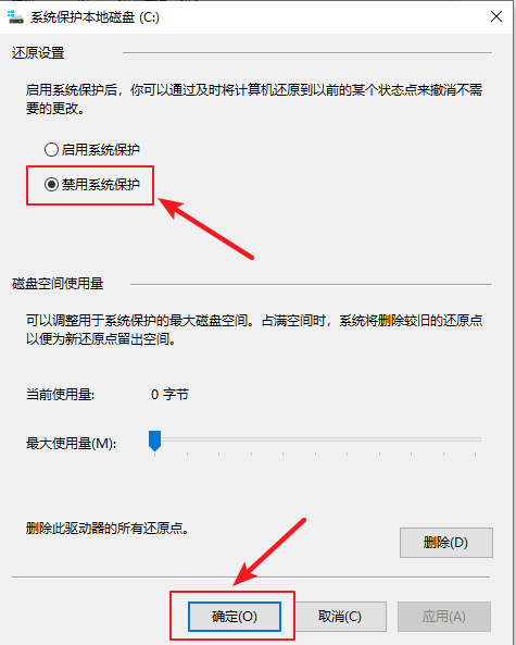 4.選擇【禁用系統(tǒng)保護(hù)】,最后點(diǎn)擊【確定】即可。