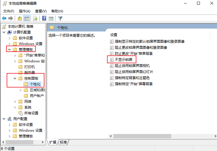 2.進(jìn)入本地組策略編輯器,在左側(cè)依次點(diǎn)開(kāi)【管理模板】-【控制面板】-【個(gè)性化】,然后在右側(cè)找到并雙擊打開(kāi)【不顯示鎖屏】。