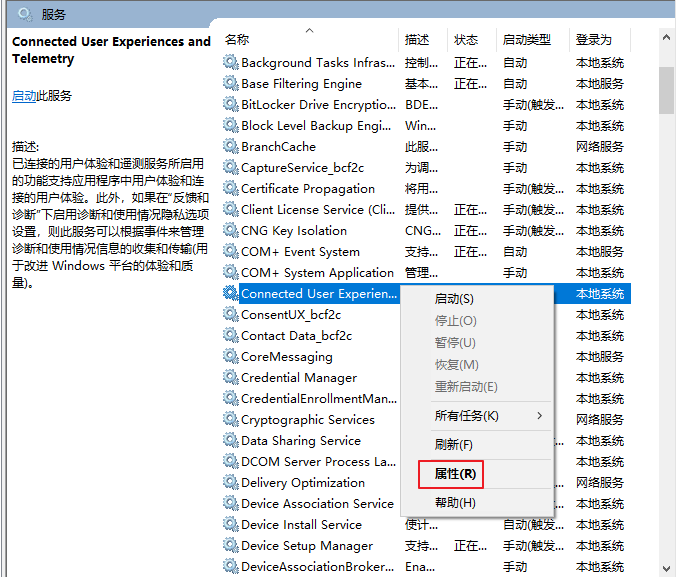 3.然后雙擊打開【服務(wù)和應(yīng)用程序】-【服務(wù)】,下拉找到【Connected User Experiences and Telemetry】,右鍵選擇【屬性】。