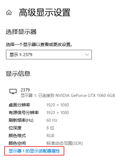 3.彈出高級(jí)顯示設(shè)置窗口,往下拉,點(diǎn)擊【顯示適配器屬性】。