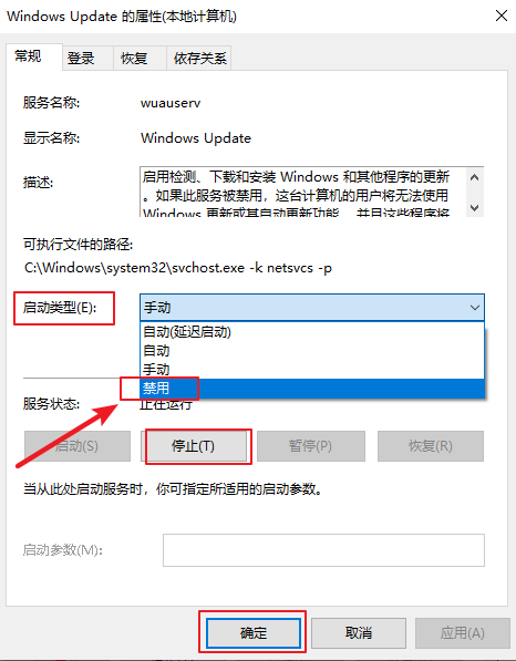3.把啟動(dòng)類型改為【禁用】,然后點(diǎn)擊下面的【停止】,接著點(diǎn)擊【應(yīng)用】和【確定】。