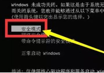 2.如果不可以解決問題,按F8,選擇【安全模式】,界面會(huì)同樣出現(xiàn)【配置windows update失敗,還原更新,請(qǐng)勿關(guān)機(jī)】,稍等片刻,稍后會(huì)自動(dòng)關(guān)機(jī)。