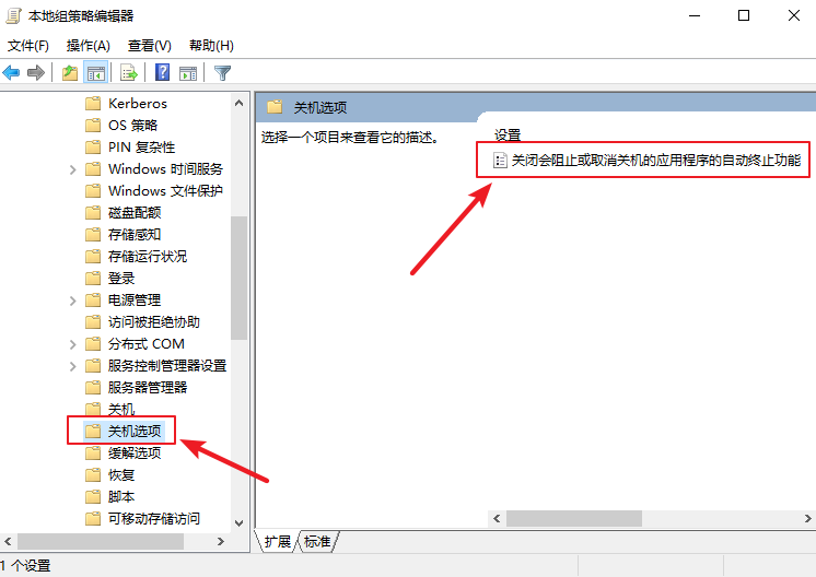2.本地組策略編輯器,在左側(cè)計算機配置下依次點開【管理模板】-【系統(tǒng)】-【關(guān)機選項】,然后在右側(cè)雙擊【關(guān)閉會阻止或取消關(guān)機的應用程序的自動終止功能】。