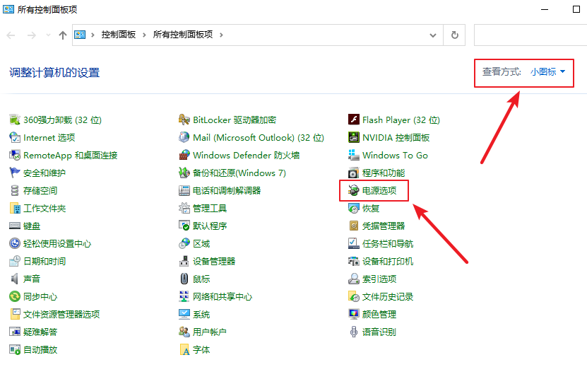 2.進入后,把左上角的查看方式切換為【小圖標】,然后找到并點擊【電源選項】。