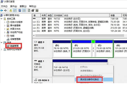 2.進(jìn)入后,在左側(cè)選擇【磁盤管理】,在右側(cè)右擊可移動硬盤,選擇【更改驅(qū)動器和盤符】。