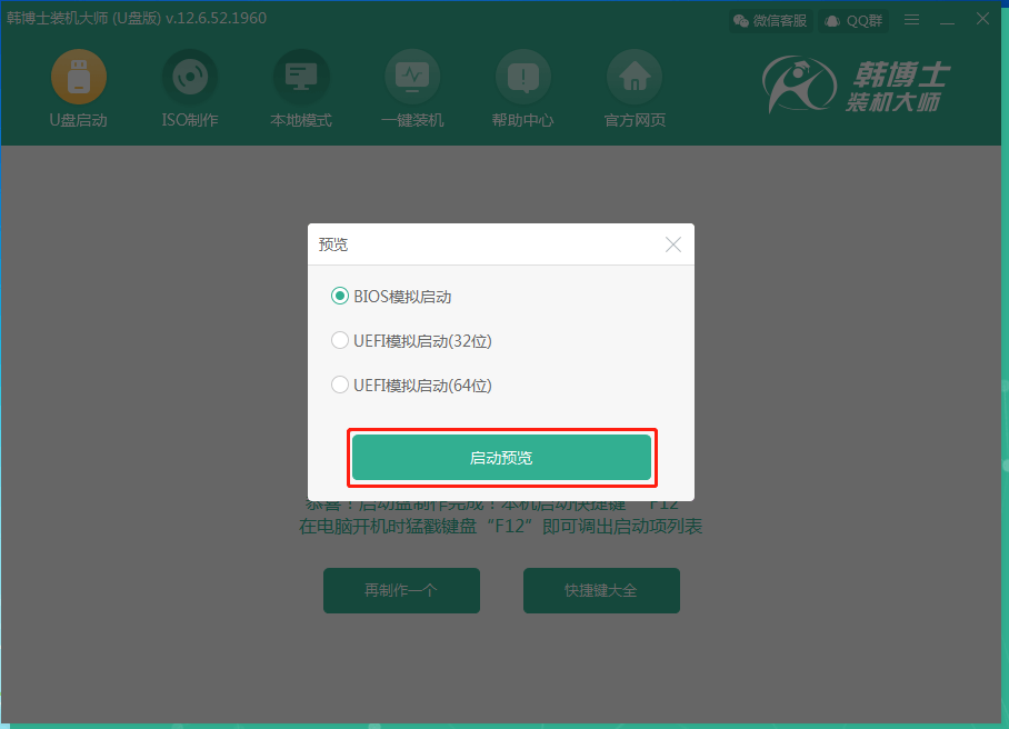 6.制作完畢后,會(huì)彈出U盤(pán)模擬啟動(dòng)的預(yù)覽選擇窗口,此時(shí)可以點(diǎn)擊“啟動(dòng)預(yù)覽”或者關(guān)閉;