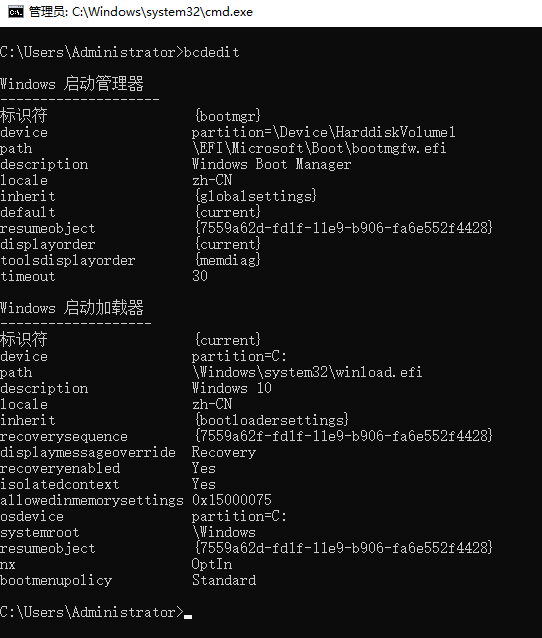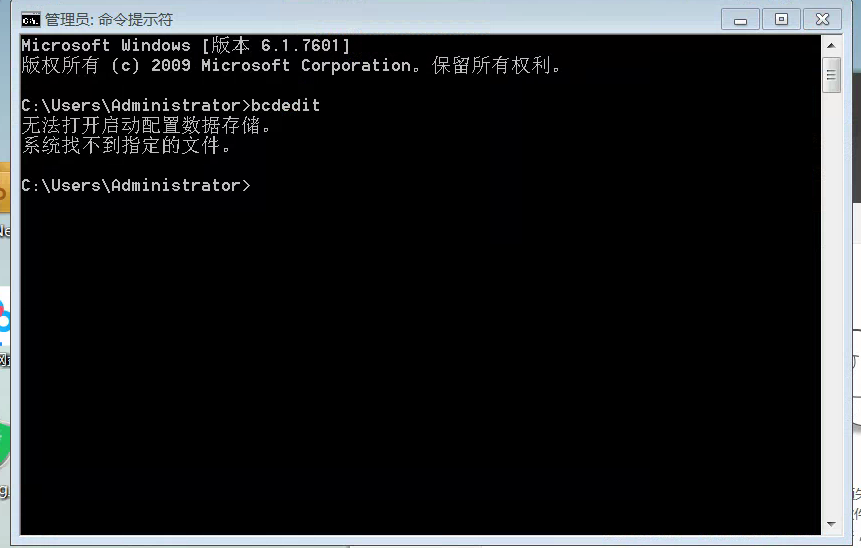 2.在命令提示符窗口輸入 ‘bcdedit’ ,查看是否能否打開這個文件
