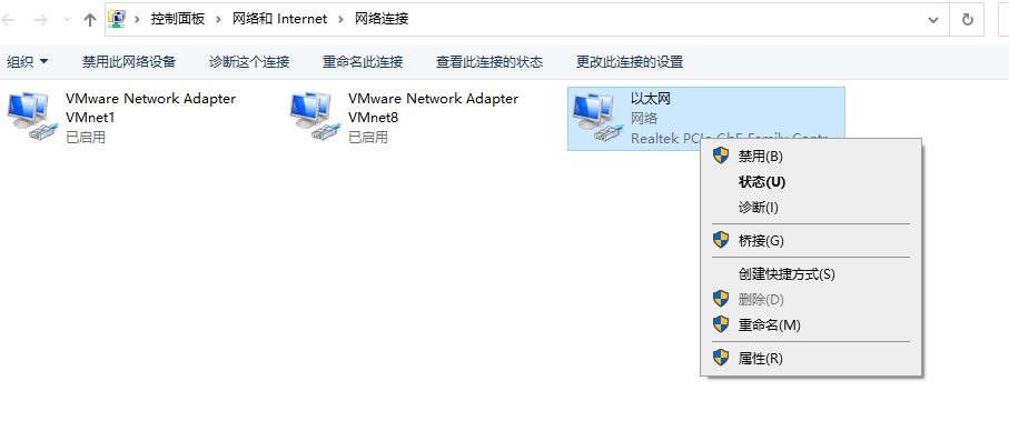 第五步- 右擊 正常使用的網(wǎng)絡(luò)設(shè)配器(小編目前是在使用網(wǎng)線,而另外兩個是虛擬機(jī)的虛擬網(wǎng)卡,所以就是右擊第三個),點(diǎn)擊屬性