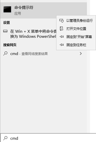 第十五步- 點(diǎn)擊 ‘開始菜單’ ,輸入‘cmd(命令提示符)’ ,右擊 ‘命令提示符‘ ,點(diǎn)擊 ‘以管理員身份進(jìn)行運(yùn)行’