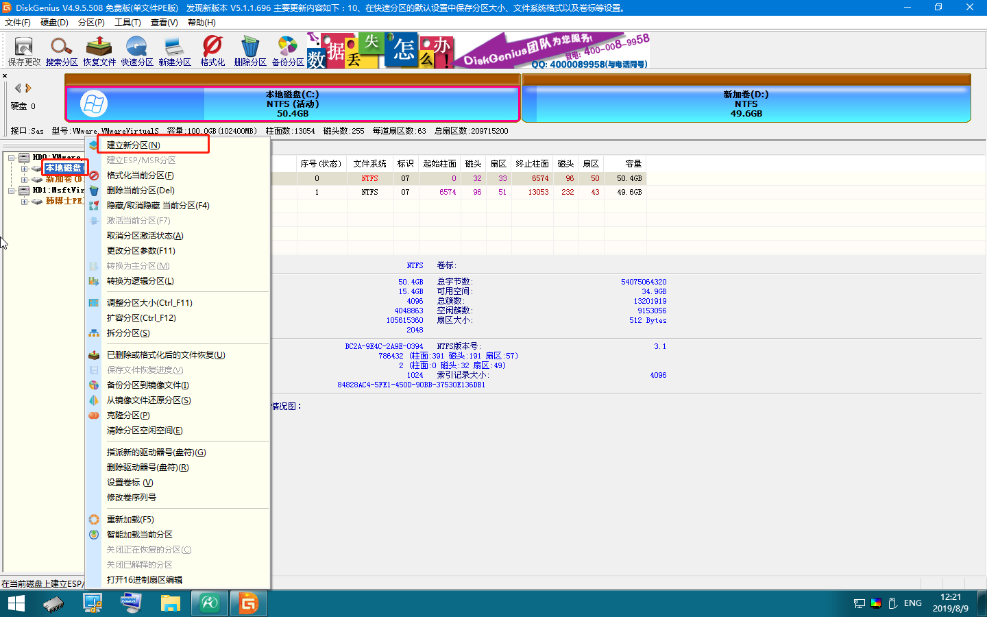 2.在“分區(qū)工具”界面中選擇需要分區(qū)的磁盤,這里以系統(tǒng)盤為例,右鍵選擇“建立新分區(qū)”,點擊“開始”,等待分區(qū)成功。