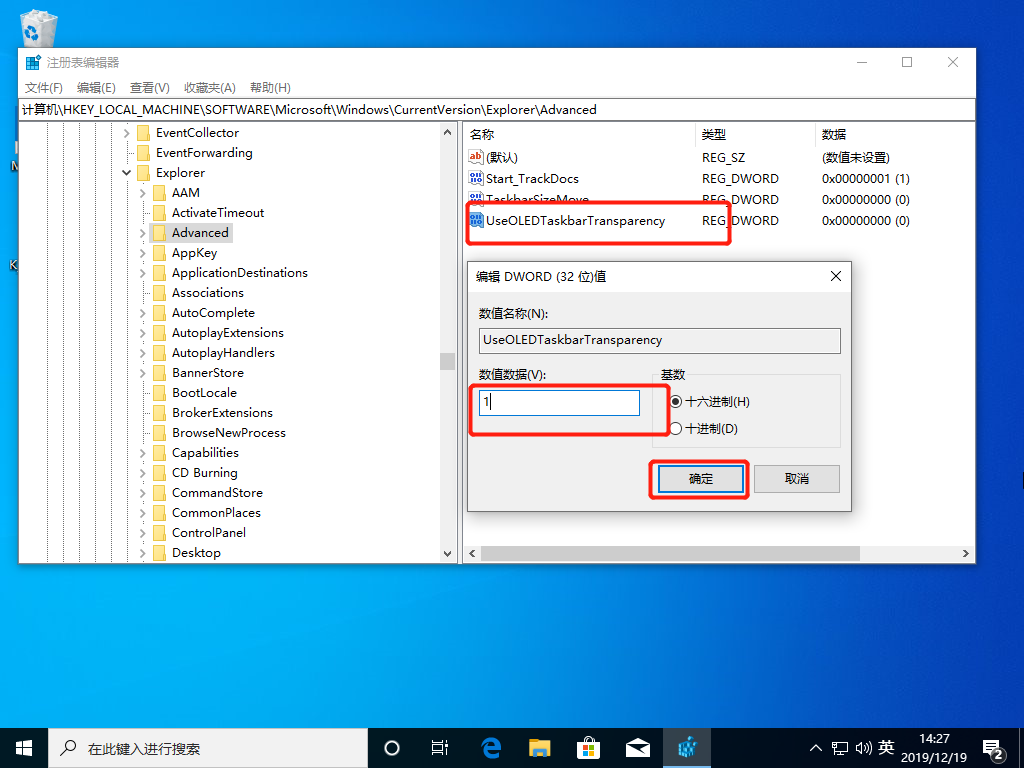 5.將其命名為UseOLEDTaskbarTransparency后雙擊打開,將值改為“1”并“確定”,隨后重啟即可。