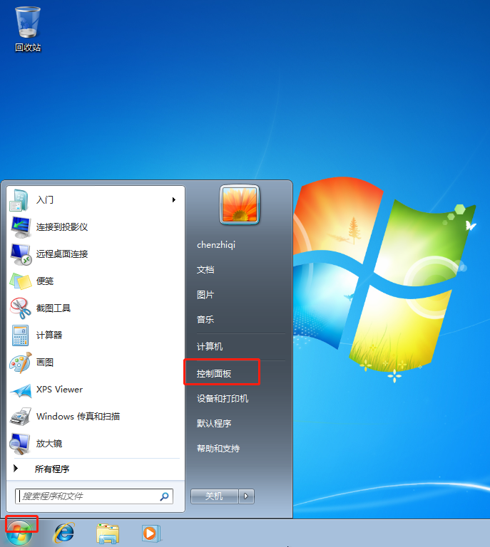 1.點(diǎn)擊win7桌面“開(kāi)始菜單”圖標(biāo),隨后選擇“控制面板”進(jìn)入;