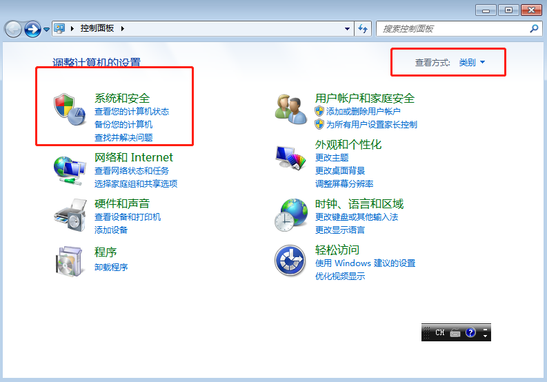 2.在打開(kāi)的控制面板界面中將“查看方式”改為“類(lèi)別”,選擇“系統(tǒng)和安全”進(jìn)入;