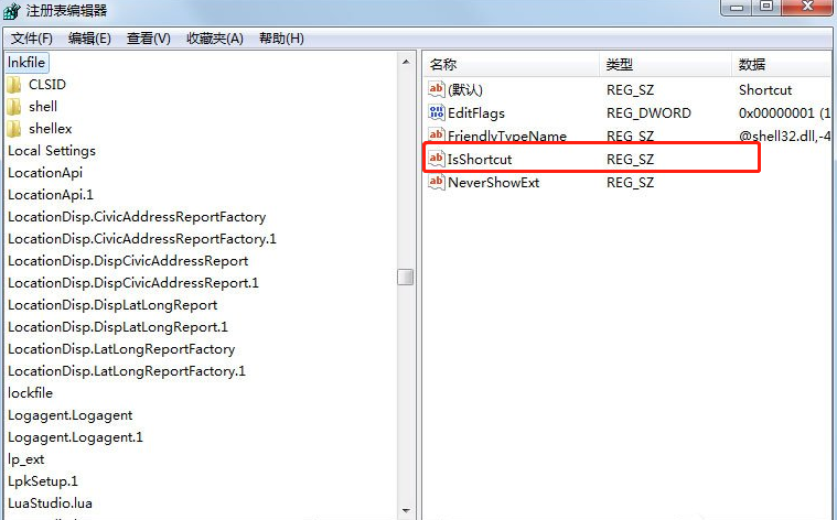 2.在打開的注冊表編輯器界面中找到“HKEY_CLASSES_ROOT”中的“l(fā)nkfile”,右鍵選中“isshortcut”并刪除,隨即重啟計(jì)算機(jī)即可生效。