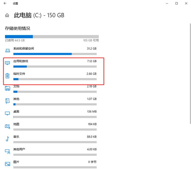 2.此時電腦會跟手機(jī)一樣顯示出電腦的存儲空間信息,我們可以在“臨時文件”和“應(yīng)用和游戲”中刪除無用文件,釋放存儲空間。