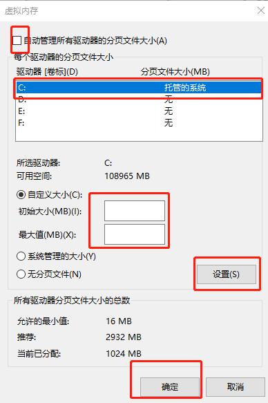 2.在以下窗口中取消勾選“自動管理分頁文件大小”復(fù)選框,如下圖所示。將空間設(shè)置好大小后點(diǎn)擊“設(shè)置”并“確定”,最后重啟電腦就可以完成虛擬內(nèi)存的轉(zhuǎn)移了。