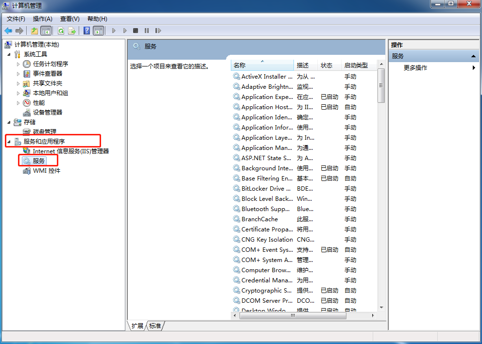 1.右鍵點(diǎn)擊win7桌面“計(jì)算機(jī)”圖標(biāo),隨后選擇“管理”進(jìn)入;在打開的管理界面中找到“服務(wù)和應(yīng)用程序”下的“服務(wù)”,如圖所示: