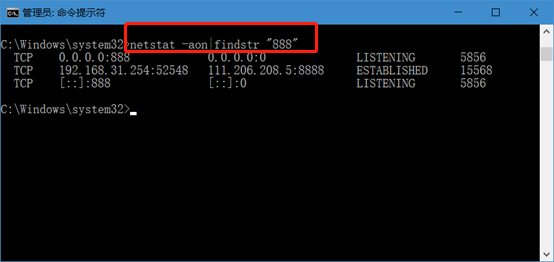 2.如果我們想知道特定端口號(hào)究竟被哪個(gè)程序占用,可以直接輸入命令“netstat – aon|findstr “端口號(hào)””進(jìn)行查詢,小編以端口號(hào)“888”為例。
