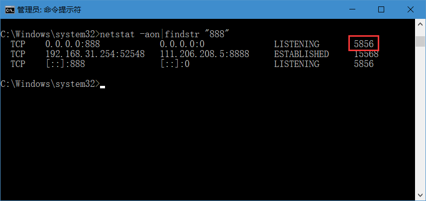 3.此時(shí)我們就可以看到該端口被“5856”的程序所占用。(最后一列為pid數(shù)字)