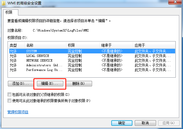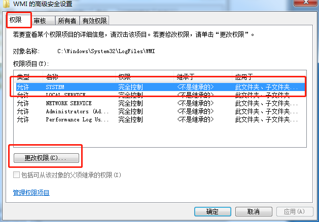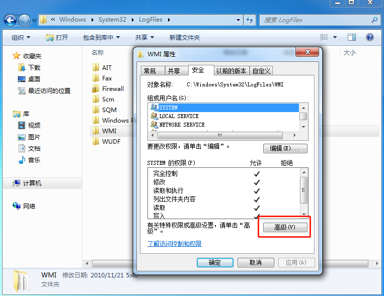 2.找到并右鍵選中“WMI文件夾”,打開“屬性”,直接獲得永久管理員的權(quán)限。開始選擇“安全”下的“高級(jí)”,如圖所示: