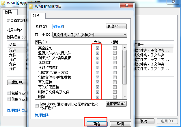 5.在彈出的權(quán)限項(xiàng)目窗口中勾選完全控制下的所有復(fù)選框,最后點(diǎn)擊“確定”。