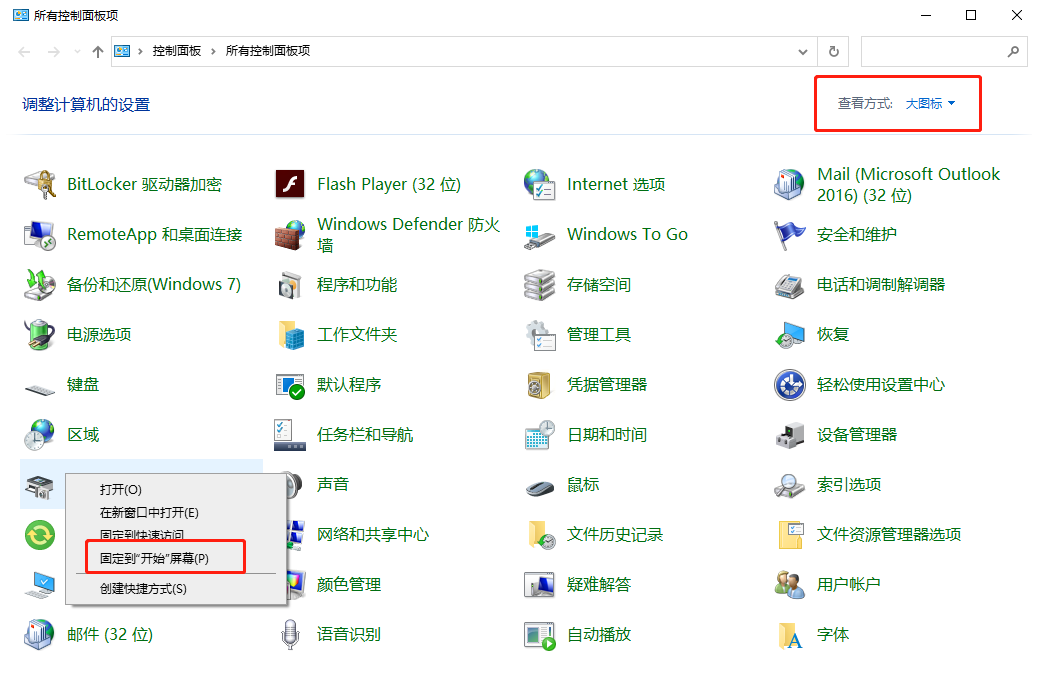 2.將右上角查看方式改為“大圖標(biāo)”,右鍵選中“設(shè)備和打印機”,最后選擇“固定到開始屏幕”。