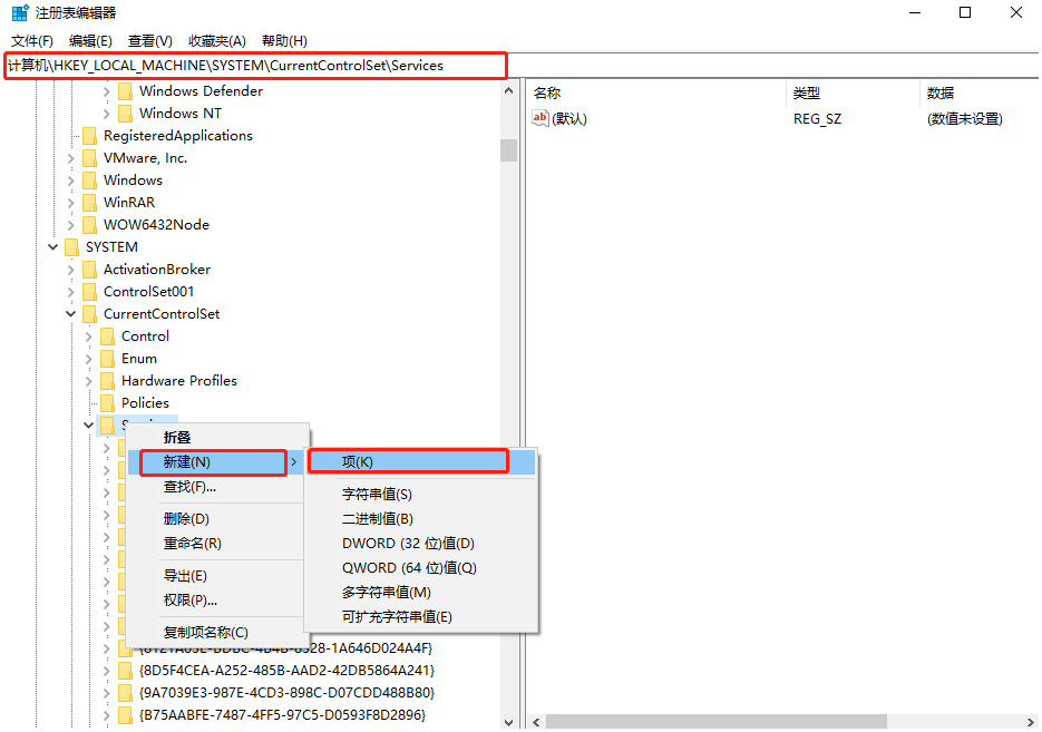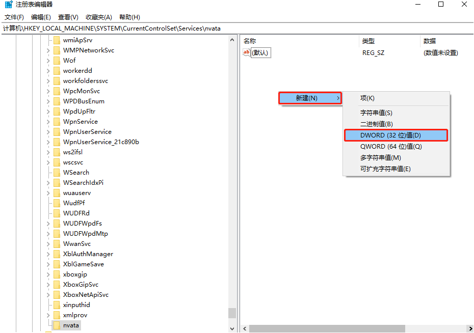 2.在打開的界面中依次展開計算機\HKEY_LOCAL_MACHINE\SYSTEM\CurrentControlSet\Services\nvata,如果找不到該項,則需要進行“新建”子項后將其命名為“nvata”。