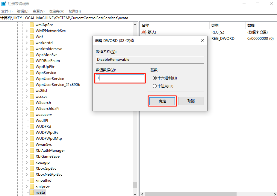 3.此時在nvata文件夾下開始新建DWORD(32 位)值并命名為DisableRemovable。