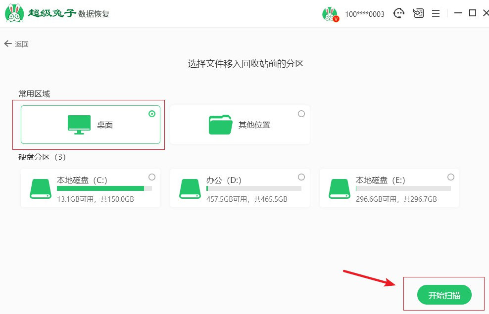 2.根據(jù)需要選擇被刪除文件的分區(qū),這里選擇桌面為例,完成后點擊開始掃描。