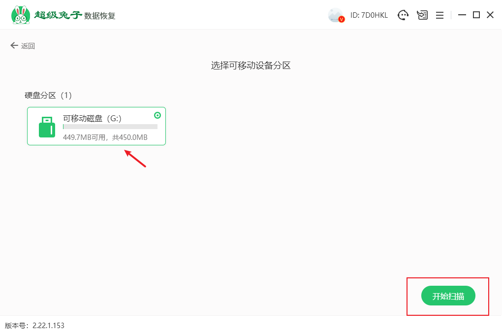 2.點(diǎn)擊選擇插入的移動(dòng)硬盤(pán)分區(qū)(提前插入電腦的u盤(pán)),然后點(diǎn)擊開(kāi)始掃描。